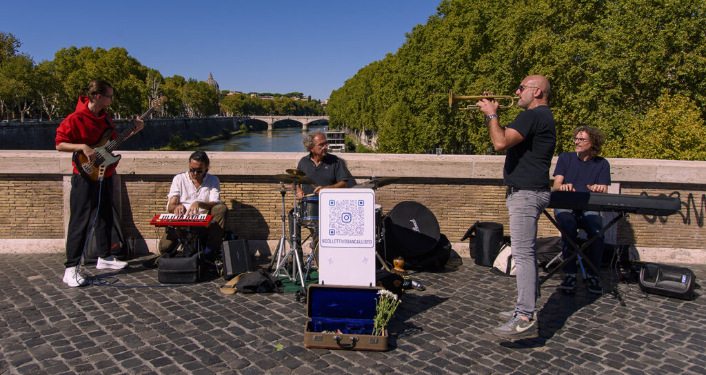 Quella forma trova l’attuazione migliore proprio nel musicista di strada. Proprio in quanto non ci sono tramiti tra l’emissione e la percezione, a parte qualche metro di aria, non ci sono sono secondi fini, a parte quello di procacciarsi qualche soldo, devoluto volontariamente dagli astanti e destinato primariamente alla sua sopravvivenza, che dovrebbe essere il primo diritto per ciascuno di noi ma invece è il primo a essere negato, proprio perché altrimenti verrebbero meno le stesse basi sulle quali si regge l’ordinamento capitalista.