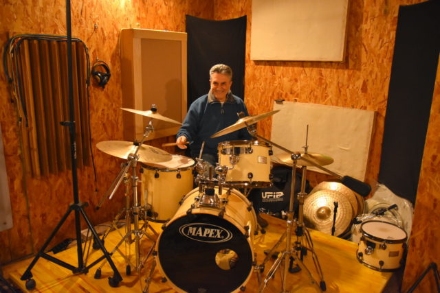 Massimo ci tiene montata la batteria, che a suo dire acquisisce una sonorità più gradevole e naturale. Per dimostrarlo sposta un tom a terra, lo posa sul pavimento e ci picchia sopra un paio di colpi, che appaiono duri, secchi e sostanzialmente privi di decadimento. Poi lo riporta sulla pedana, picchia nuovamente sulla pelle, che ora è più bella: piena, meglio diffusa in ambiente e soprattutto dal decadimento più lento e graduale, che ne rende decisamente più interessante la sonorità per l’udito.